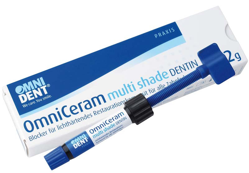 OmniCeram multi shade zur Abdeckung von Zahnverfärbungen verwendet wird. Maximale Schichtstärke 1 mm. Aushärtezeit jeder Schicht 20 Sek. (Lichtintensität von min. 1.000 mW/cm²)