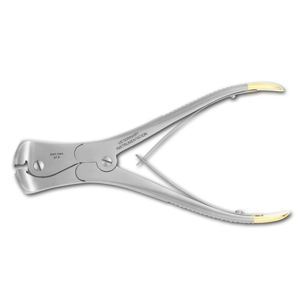 Eine effektive Scherwirkung, die ein quadratisches Ende eines Schnittpins und nicht die typischere scharfe Kante erzeugt. Die Backen fangen das lose Bolzenende ein und verhindern, dass es abfliegt. Dieser Fräser schneidet Stifte bis 1,5 mm unter die Schneidefläche. Auch zum sauberen Schneiden von Cerclagedraht geeignet. T.C. Backen.
