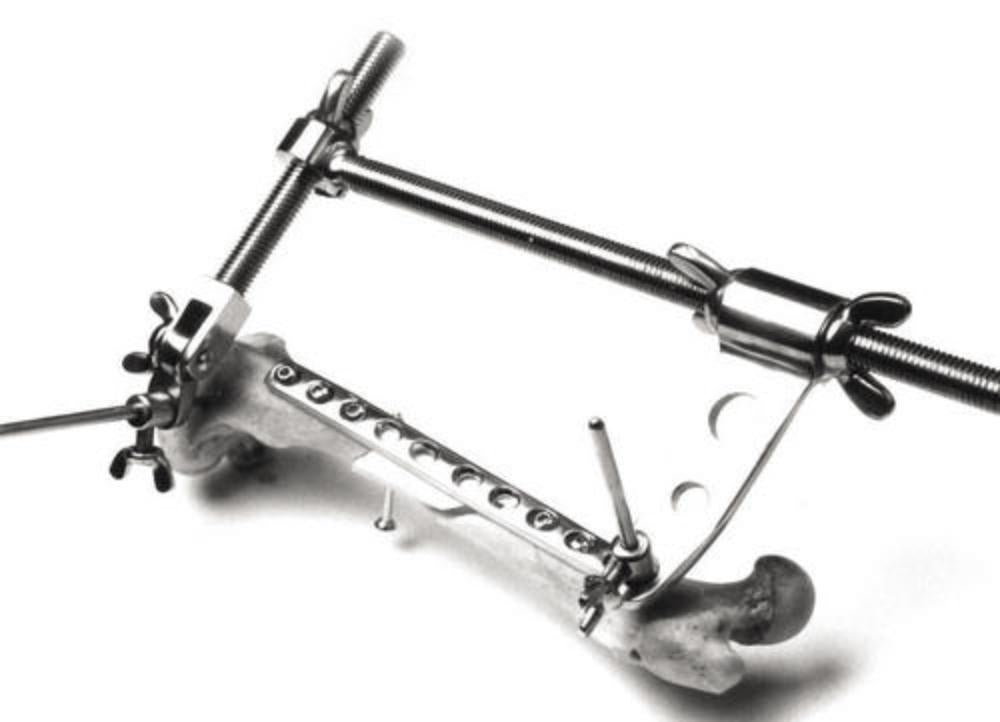 Anwendungen: Zur Überwindung von Muskelkontraktion vor der Reparatur einer Fraktur Genaues Ausrichten von Knochen vor dem Anlegen von Platten Vorteile: Locking Flügelmuttern fixieren den Spreizer wie ein Gerüst um den Knochen, um das Setzen der Platte zu ermöglichen Dreigelenkig für erhöhte Flexibilität Kombinierbar mit Fixateur extern Stangen von 3,2 bis 4,0 mm