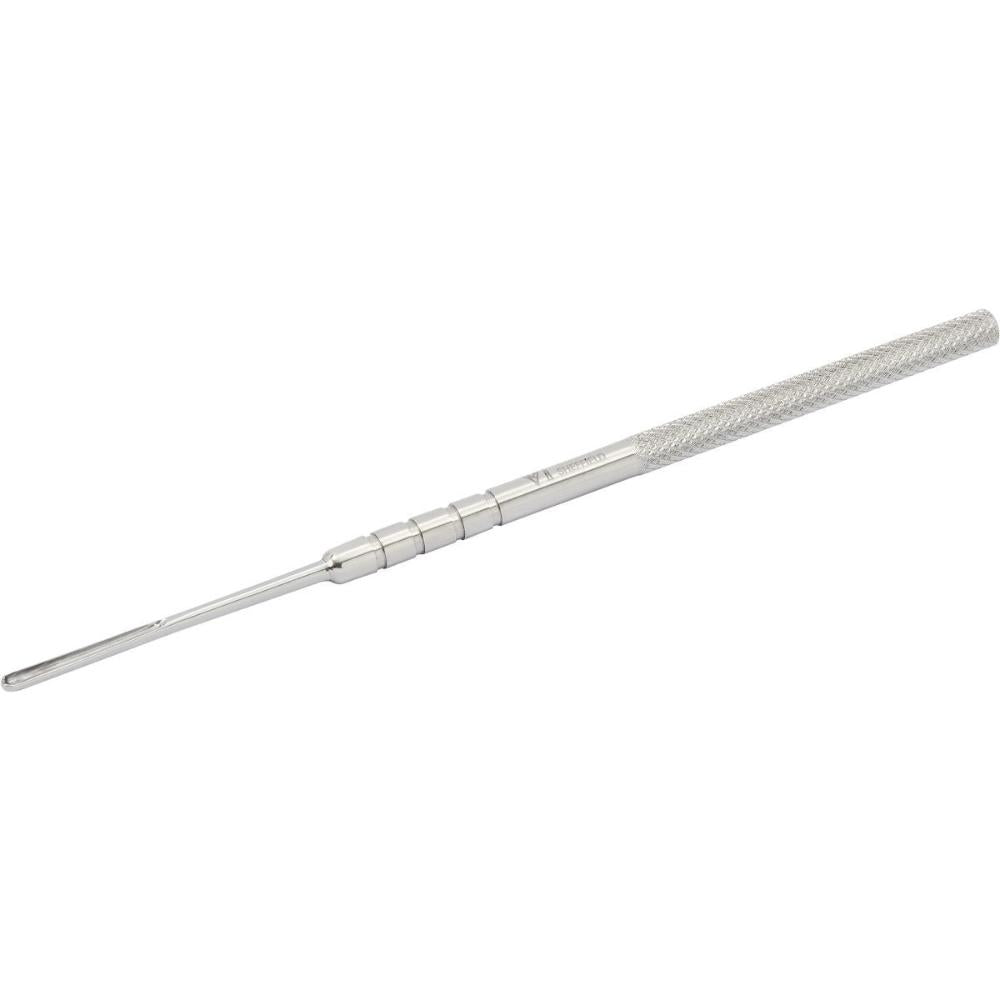 Mit dieser Kürette kann das Bandscheibenmaterial entfernt werden. Durch die Bewegung des scharfen Löffels wird das Bandscheibenmaterial aus der Tiefe entlang der Stiele herausgearbeitet.