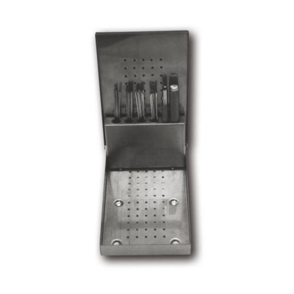 In dieser Box können Sie Arthrodese- oder Kirschnerdrähte aller Stärken, unterteilt in 4 Abteilungen, aufbewahren. Diese Box bietet zusätzlich Platz für eine Drahtbiegezange und einen Versenker für die Drahtenden.