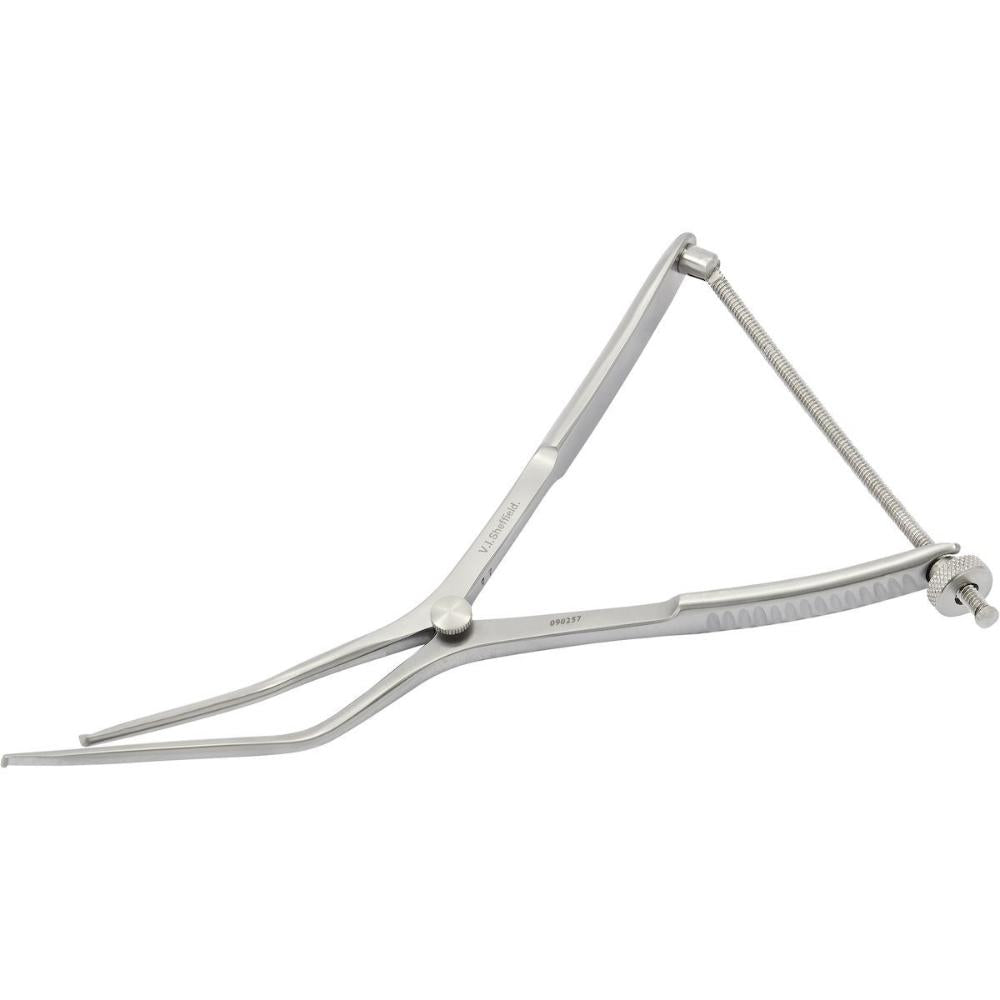 Dieser asymmetrische Wundspreizer setzt proximal und distal des betreffenden Zwischenwirbelraums an und kann mittels der Schrauben stufenlos geöffnet werden.