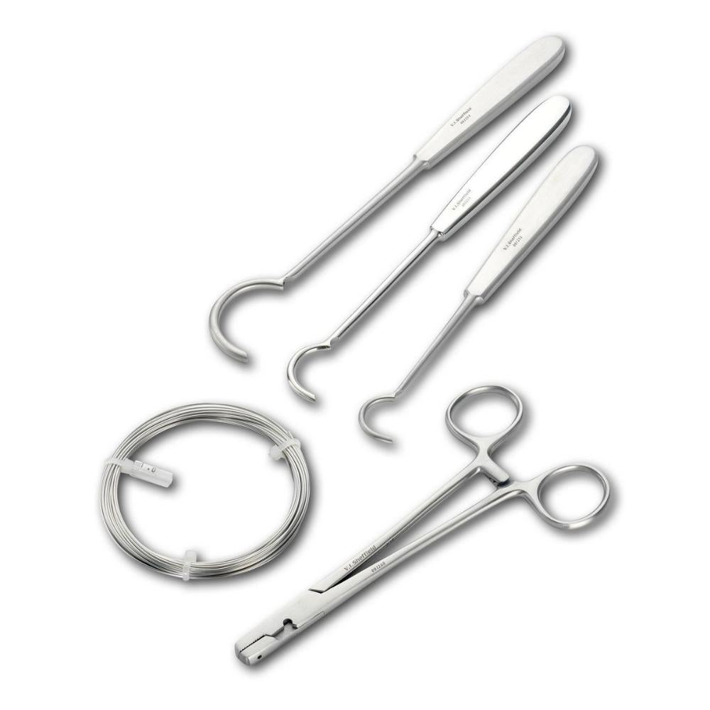 Cerclagen werden oft zum Fixieren von Knochenfragmenten verwendet. In diesem Satz finden Sie alles, was Sie dazu brauchen. Lieferumfang: Drahtbiegezange, Satz von 3 Schlingenführern, 10-m-Rolle orthopädischer Draht in der Stärke von 1,0 mm