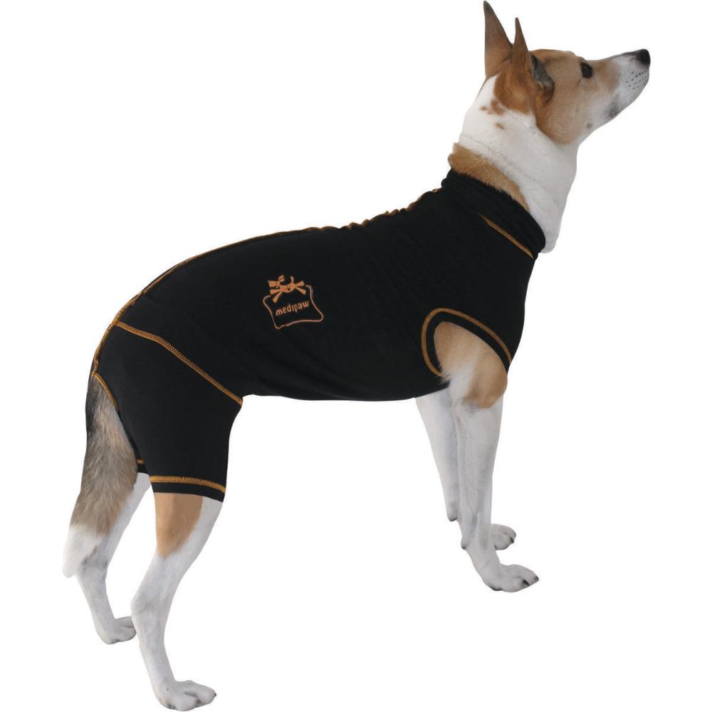 Der Medipaw Schutzbody ist in verschiedenen Größen für Katzen und Hunde erhältlich. Der Body besteht aus zwei Teilen, die mit Klettverschluss verbunden werden und den Körper des Tieres gut abdecken. Der Body kann einfach an- und ausgezogen werden. Der Body kann als Alternative zu einer Halskrause verwendet werden, als postoperativer Schutz, vor Zeckenbefall oder bei Hauterkrankungen. Katzen können durch eine breite Öffnung am Hinterteil die Katzentoilette nutzen. In die integrierten Innentaschen können Eisbeutel zum Kühlen oder Pads für Absorptionen von Wundsekret eingelegt werden. Maschinenwaschbar. Material aus 95 % Baumwolle und 5 % Lycra. Das Logo und die Nähte haben, je nach Größe, verschiedene Farben, so dass die Größen leicht zu unterscheiden sind. Größe: XXS: Pink, 33 cm lang, Brustumfang 33 cm XS: Gelb, 43 cm lang, Brustumfang 43 cm S: Blau, 48 cm lang, Brustumfang 46 cm S+: Orange, 64 cm lang, Brustumfang 56 cm M: Rot , 74 cm lang, Brustumfang 64 cm L: Grün, 89 cm lang, Brustumfang 76 cm XL: Violett, 97 cm lang, Brustumfang 86 cm S-CAT: Blau, 25 cm lang, Brustumfang 33 cm M-CAT: Rot, 30 cm lang, Brustumfang 38 cm L-CAT: Grün, 36 cm lang, Brustumfang 43 cm