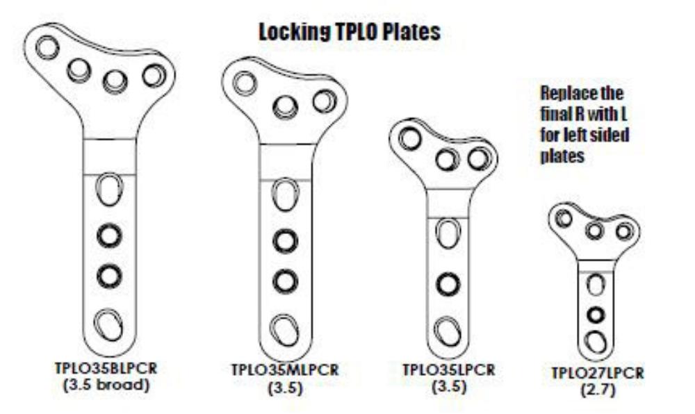 Diese Zwischengröße der 3,5 mm Locking TPLO-Platte hat einen ähnlich starken Schaft und die Mitte der 3,5 mm Platte ist breit, hat aber nur 3 Schraubenlöcher im Kopfteil für kleinere proximale Segmente.
